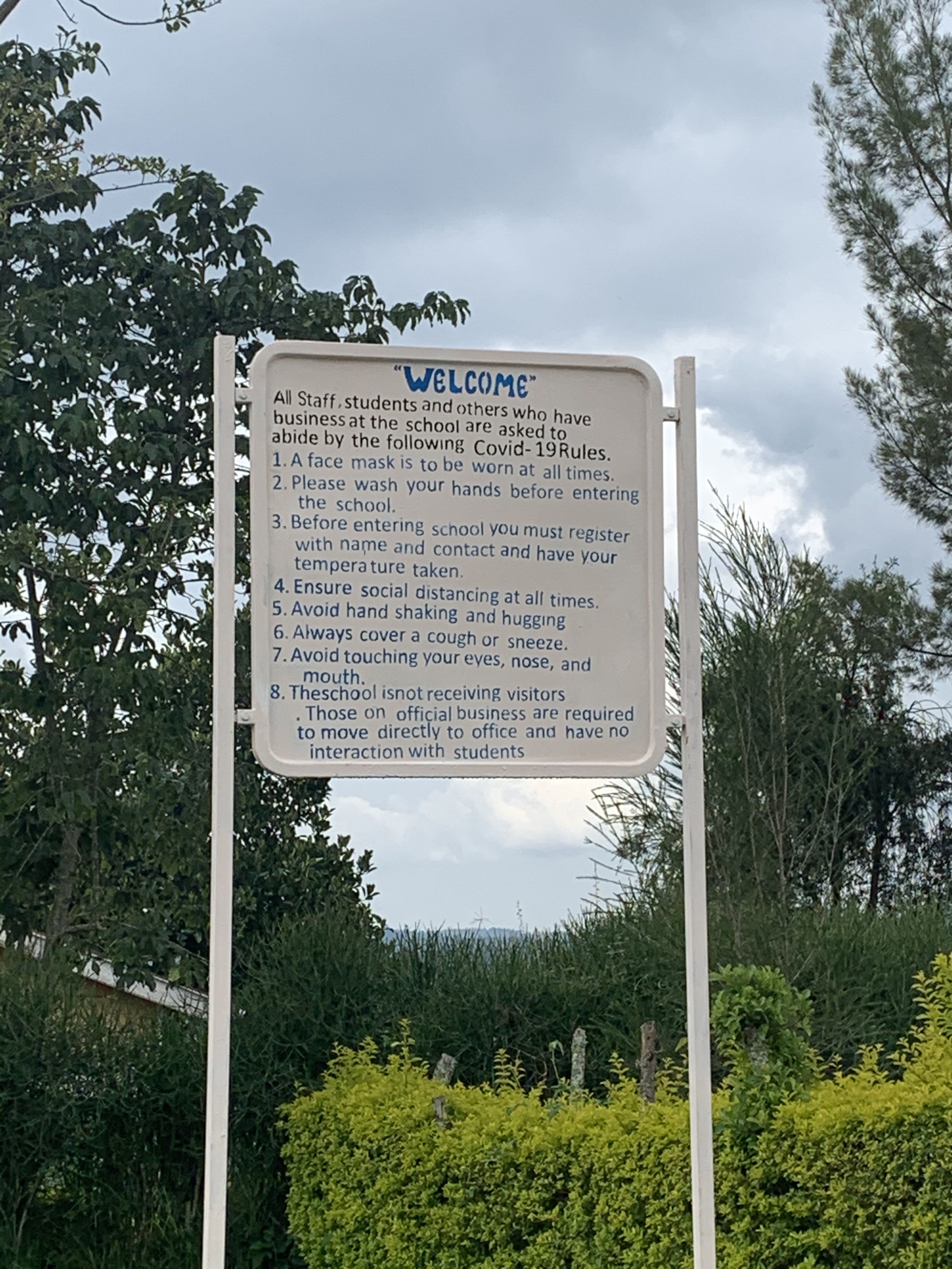 Masks must be on before entering (and worn at all times). The next step was to have your temperature checked, then wash your hands and have your property sprayed. Throughout the school we have placed new hand washing stations at dorms, classrooms, and kitchen to encourage frequent hand washing, and signs and posters are scattered every where offering reminders of what we should be doing. Wearing our masks, washing our hands, not touching our face, and social distancing. So far we off to a good start. Staff and students will have their temperature checked on a daily basis.